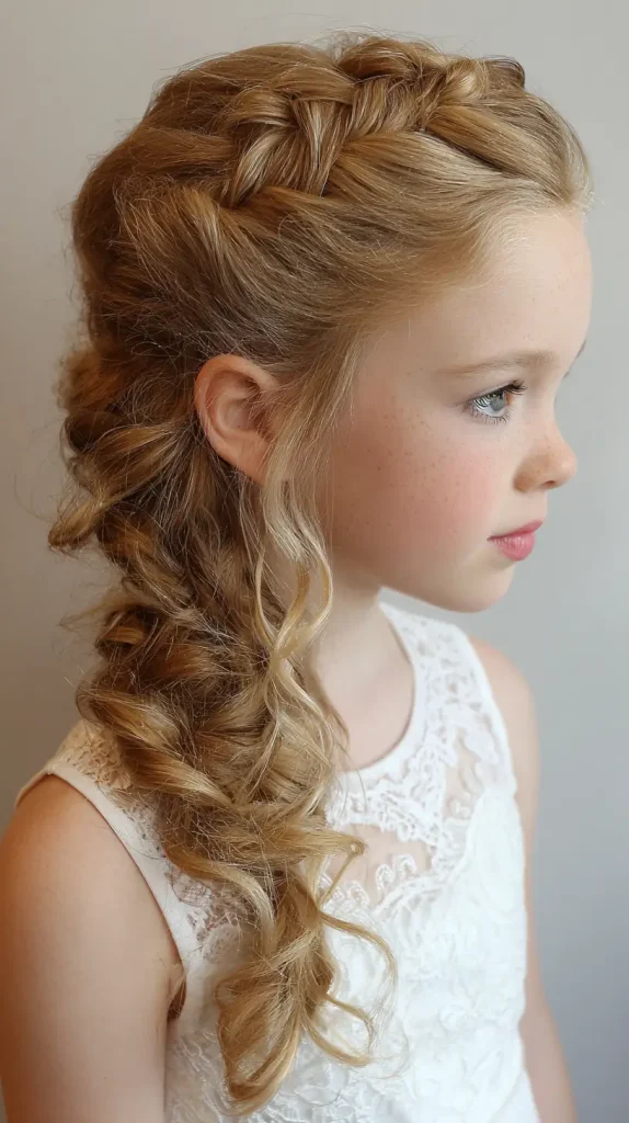 A half-up style with loose curls strikes the perfect balance between playful and elegant. Secure the top section with a bow or decorative clip, and curl the rest for a bouncy, picture-perfect finish. It’s ideal for kids who don’t like all their hair pinned up.
